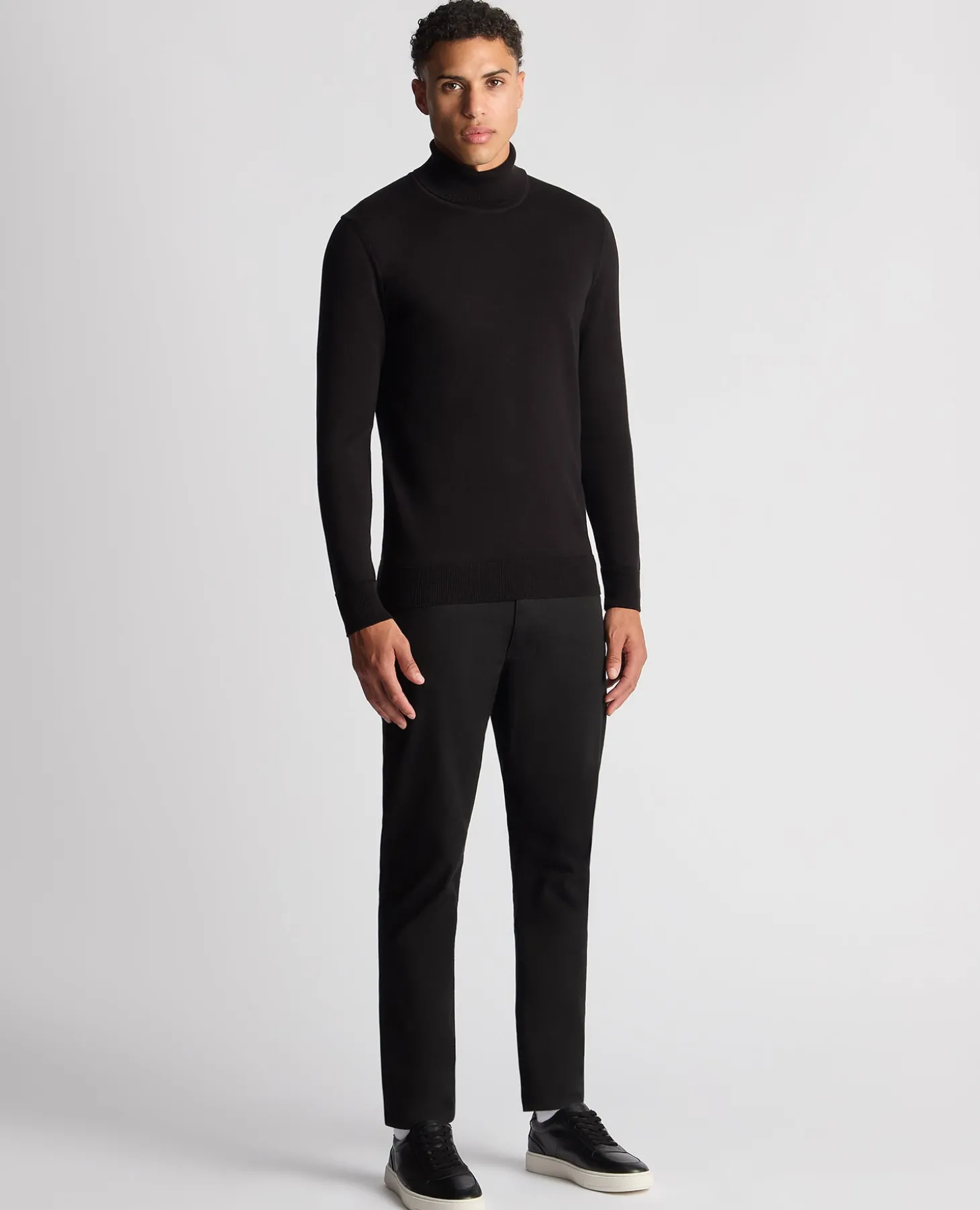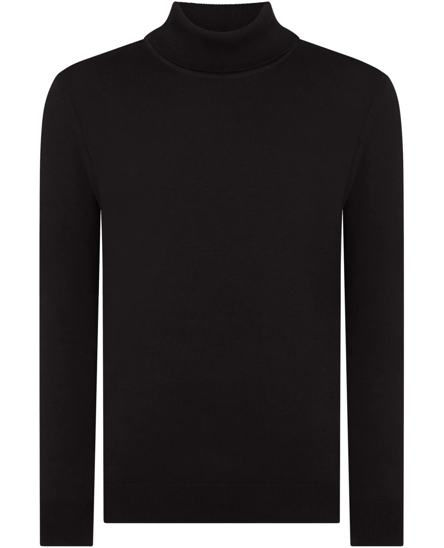 Black tapered fit fine knit cotton roll neck sweater with ribbed cuff and hem.
