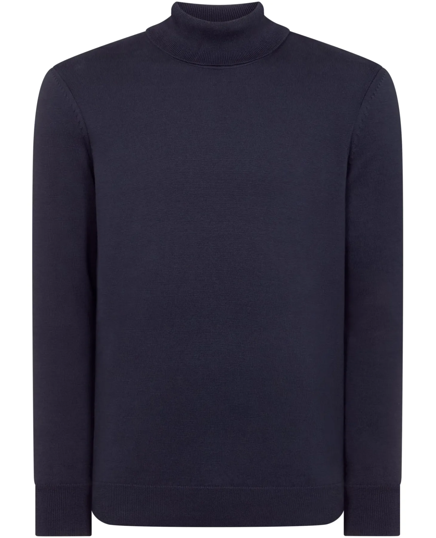Dark blue tapered fit fine knit cotton roll neck sweater with ribbed cuff and hem.