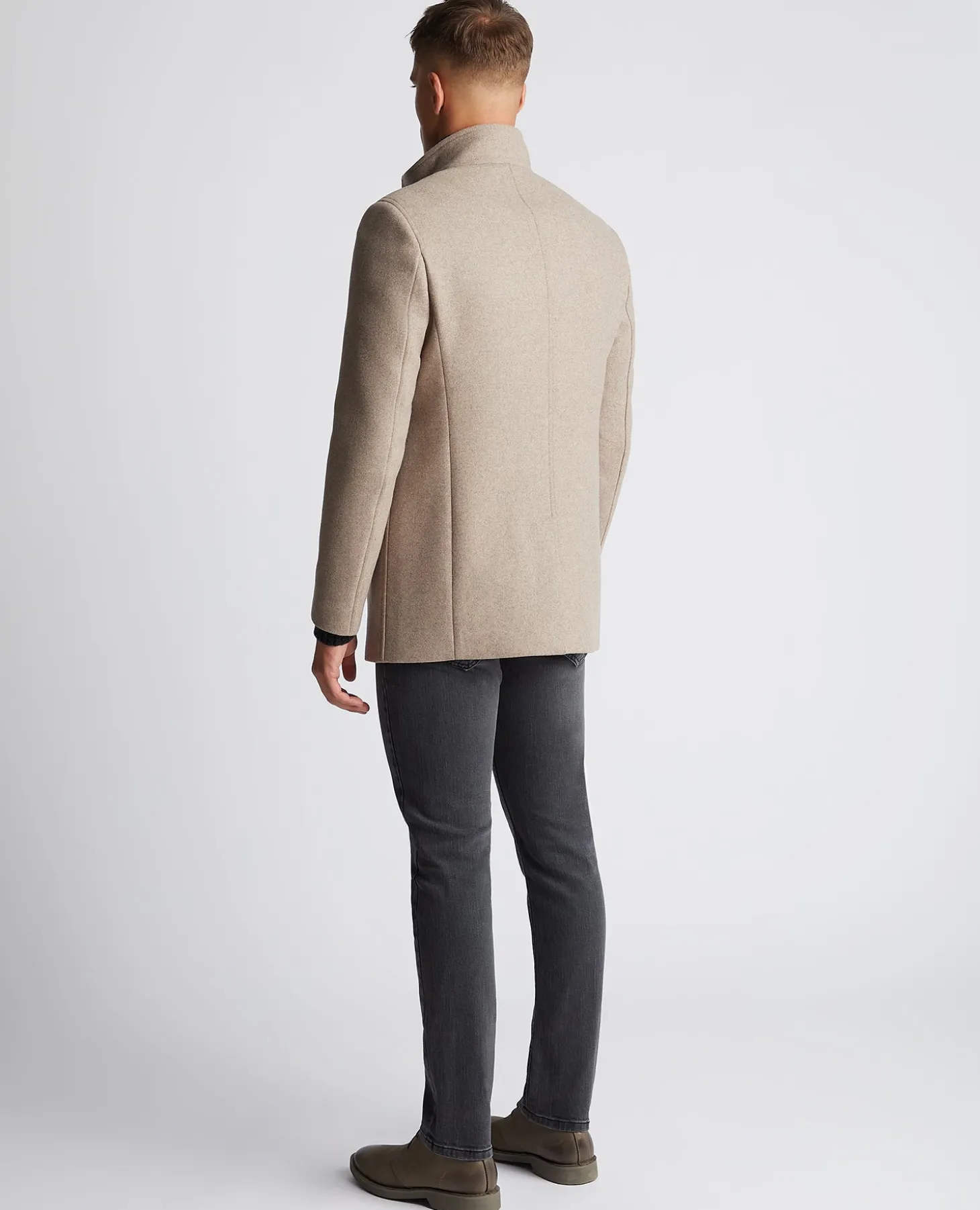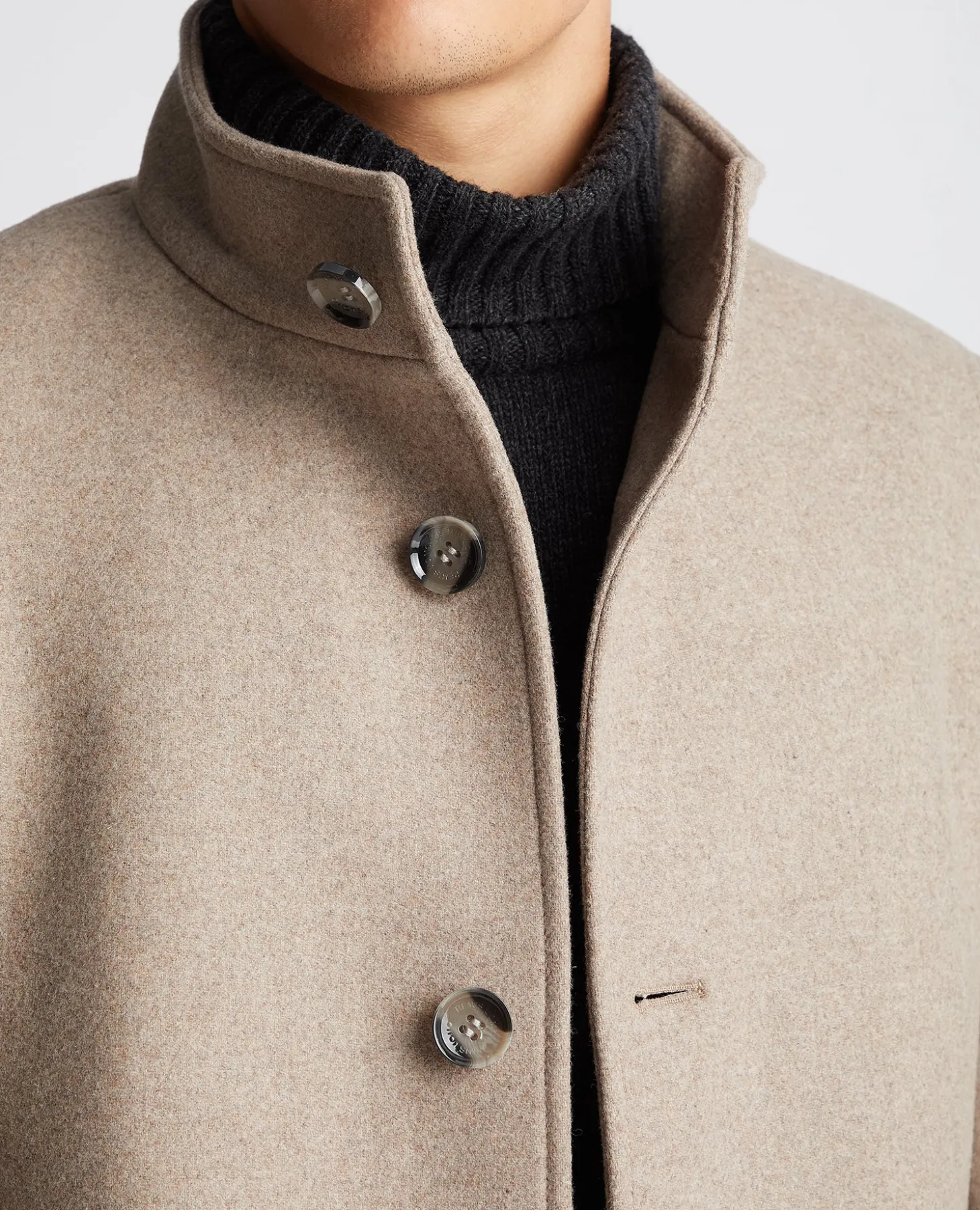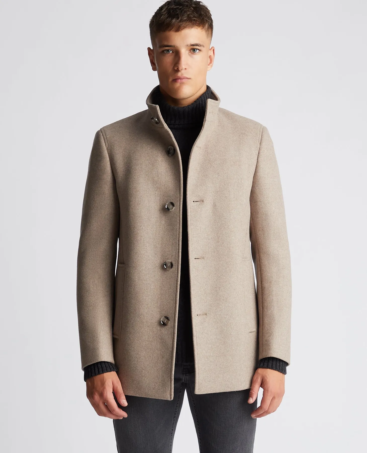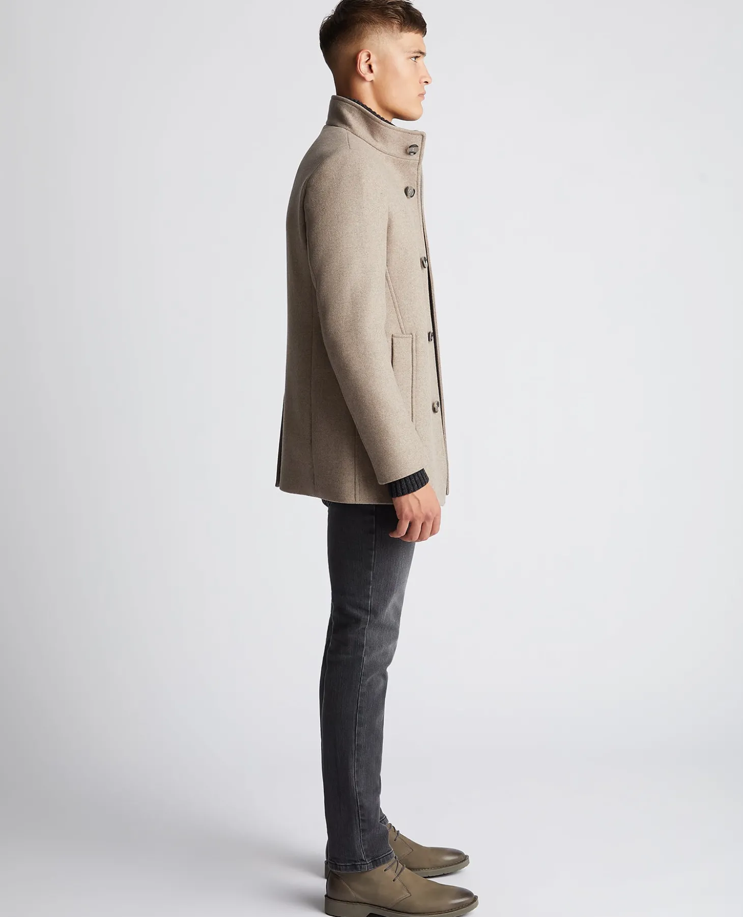 Fawn tapered fit wool-blend tailored coat with stand collar. Single breasted, five button front closing, single rear vent and front side pockets.