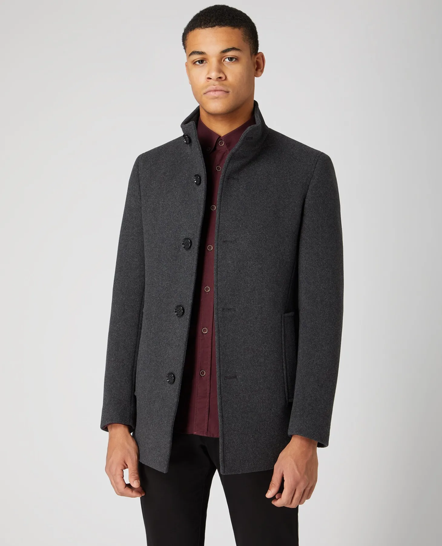 Charcoal tapered fit wool-rich tailored coat with stand collar. Single breasted, five button front closing, single rear vent and front side pockets.