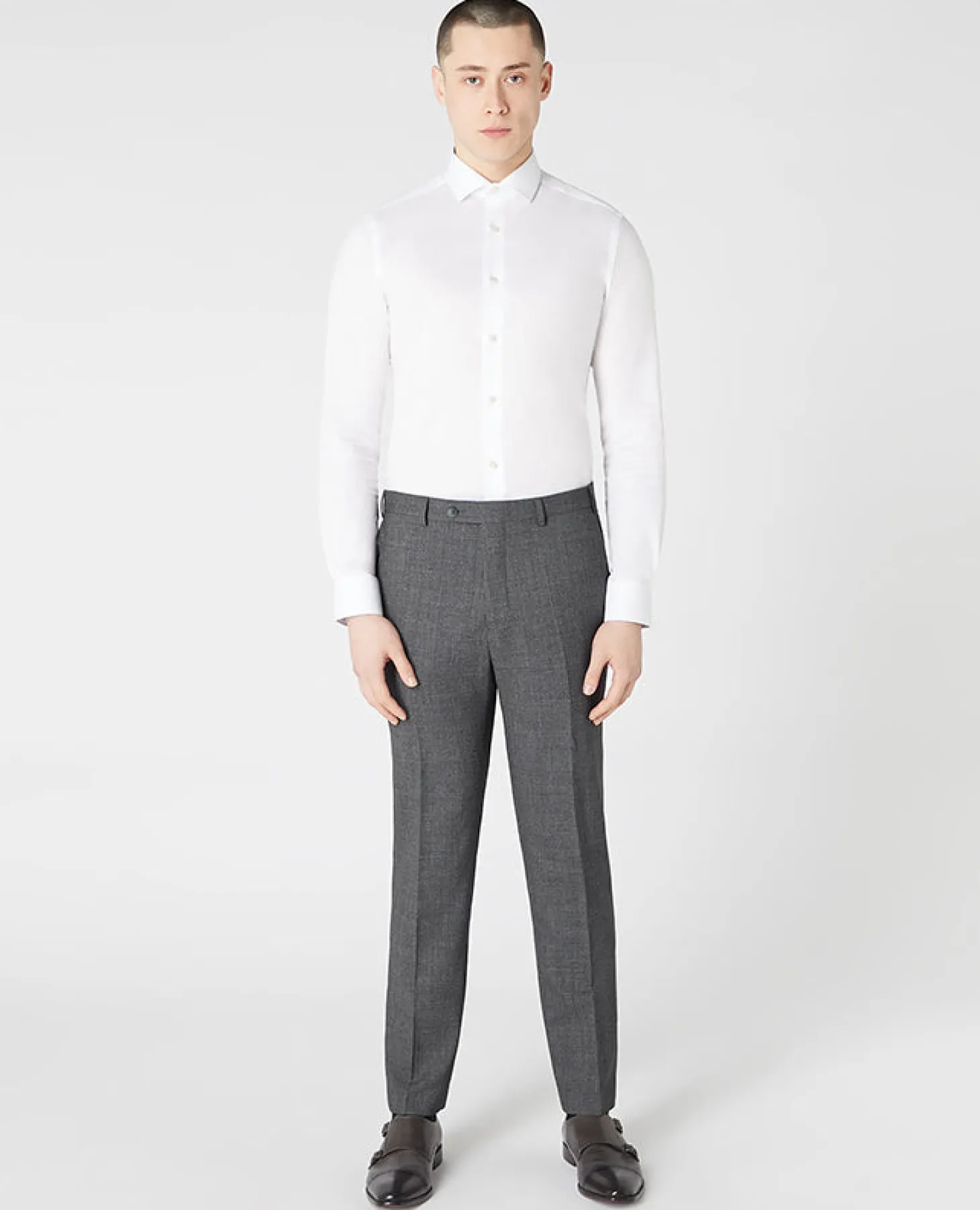Model is 6’2” /188cm tall and wears a trouser size 34R. Tapered fit is a more generous cut with more room through the leg and at the hem, while still maintaining a tailored silhouette.