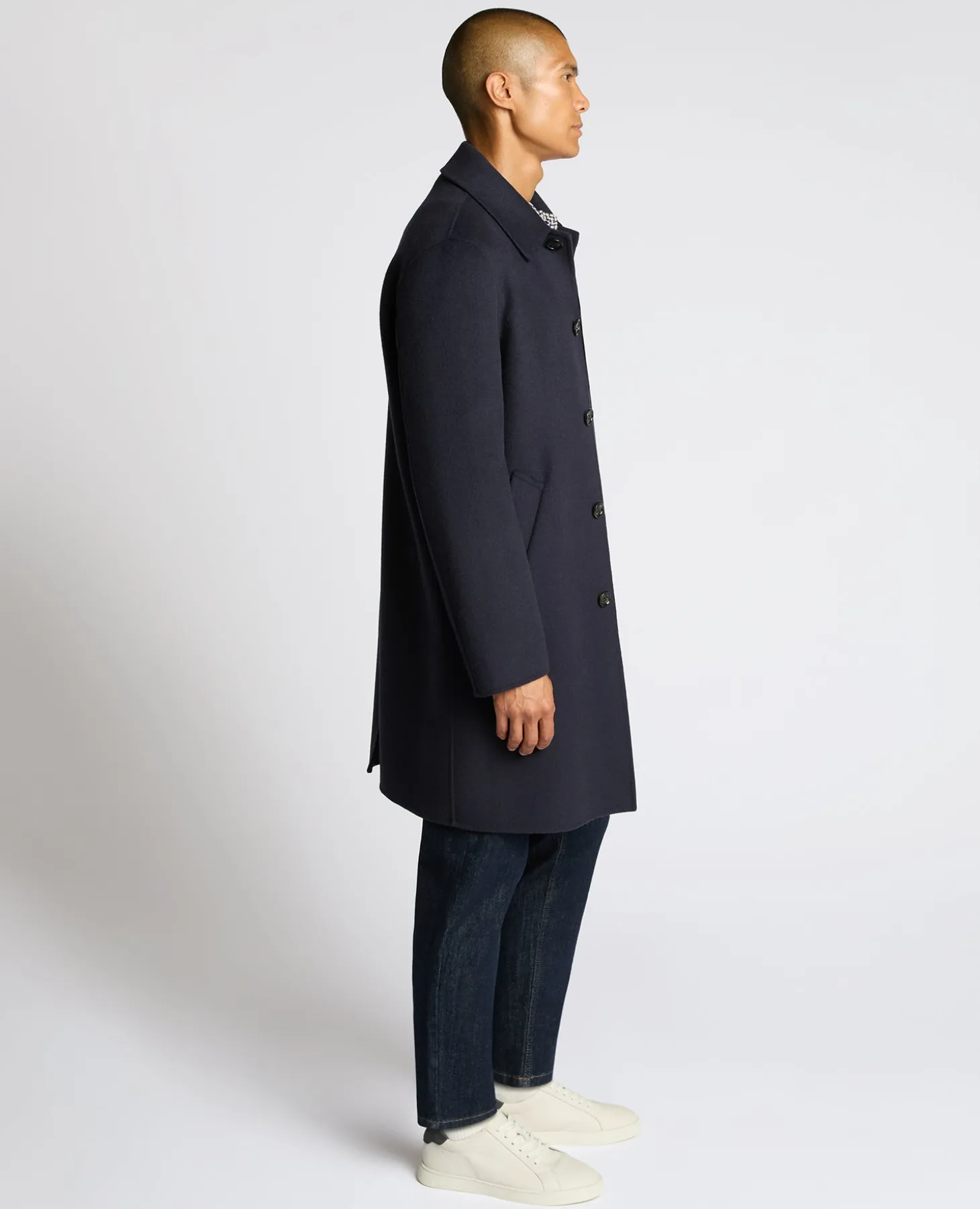 Model is 6’2” /188cm tall and wears a tapered fit overcoat, size 40. Our tapered fit is a more generous cut with more room through the chest and arm, while still maintaining a tailored silhouette.